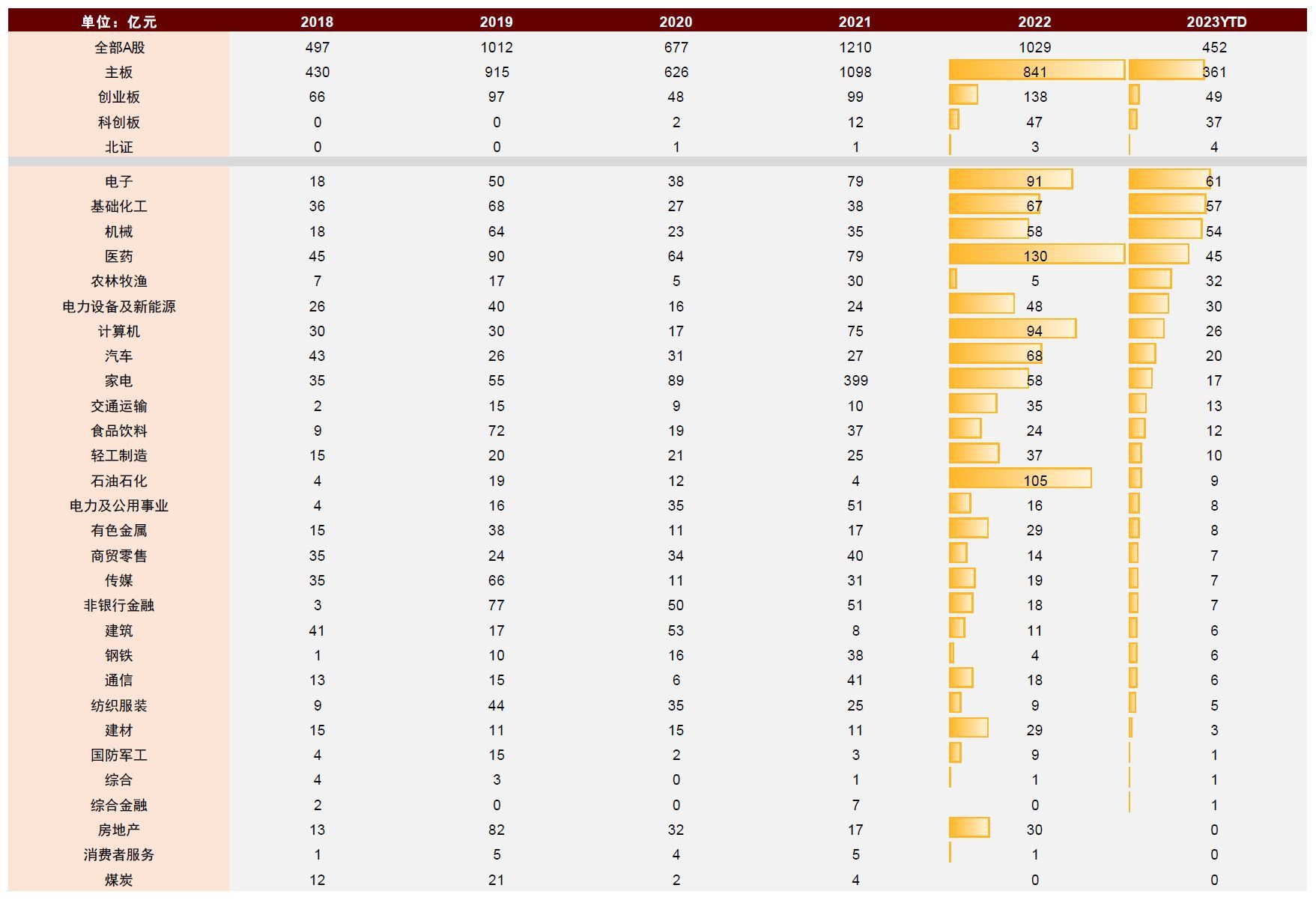 分行业看,2023年以来已实施回购的公司中,机械、医药、电子、基础化工、计算机、汽车、电力设备及新能源、轻工制造、食品饮料等行业回购家数最多。电子、基础化工、机械、医药、农林牧渔、电力设备及新能源、计算机、汽车、家电、交通运输等行业涉及回购金额相对大。