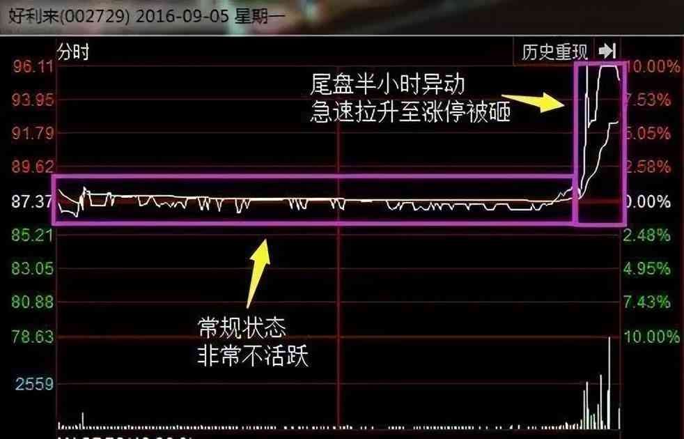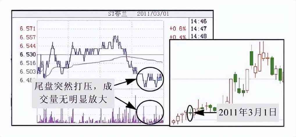 从图中可以看出,全天股价和成交量都很平淡,突然在要收盘前几分钟股价被拉得很高。