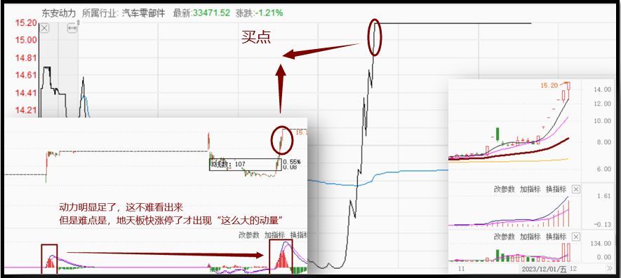 就连东安动力在12月1日,开盘前1个半小时是没有做盘资金,还晋级不了,直到接近午盘13分钟,拉出地天板才跑出量,在分时上11:17有一个小一级别买点,而涨停瞬间是正式买点,后边排板是进不去的。