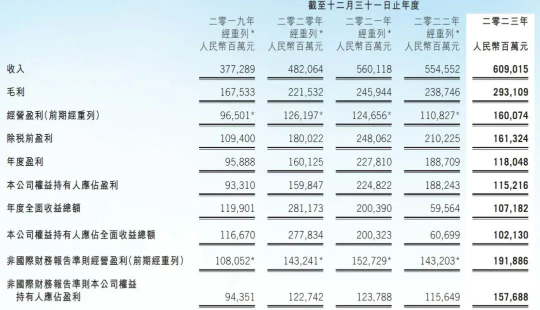 腾讯2019年、2020年、2021年、2022年、2023年年内盈利分别为958.88亿元、1601.25亿元、2278.1亿元、1887.09亿元、1180.48亿元;经调整净利分别为1080.52亿元、1432.41亿元、1527.29亿元、1432.03亿元、1918.86亿元。