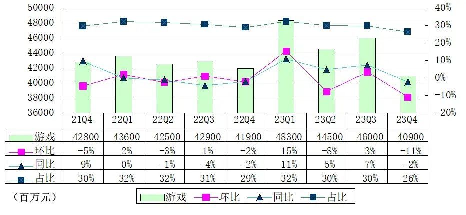 腾讯增值服务业务包含游戏收入,腾讯2023年第四季度游戏收入为409亿元,较上一季度的460亿元下降11%,相当于掉了51亿的收入,较上年同期的419亿元下降2%,掉了10亿的收入。