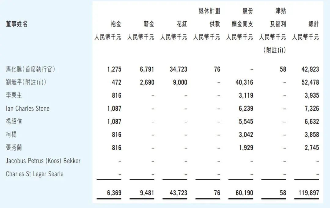 马化腾2023年总的薪酬为4292万元,刘炽平为5247.8万元,主要计入了4031.6万元的股份薪酬开支,及9万的花红,269万的薪金及47.2万的袍金。而上年度刘炽平年薪为1.87亿元,相当于跌幅高达72%。