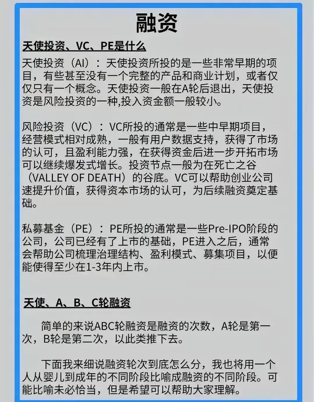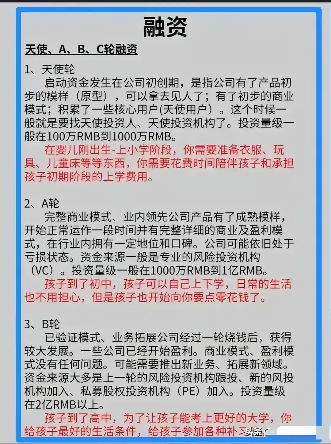接下来详细阐释融资轮次的具体划分,这里将借助一个人从婴儿成长至成年的不同阶段来比喻融资的各个阶段。也许这样的比喻并非绝对精准,但期望能够有助于大家理解。