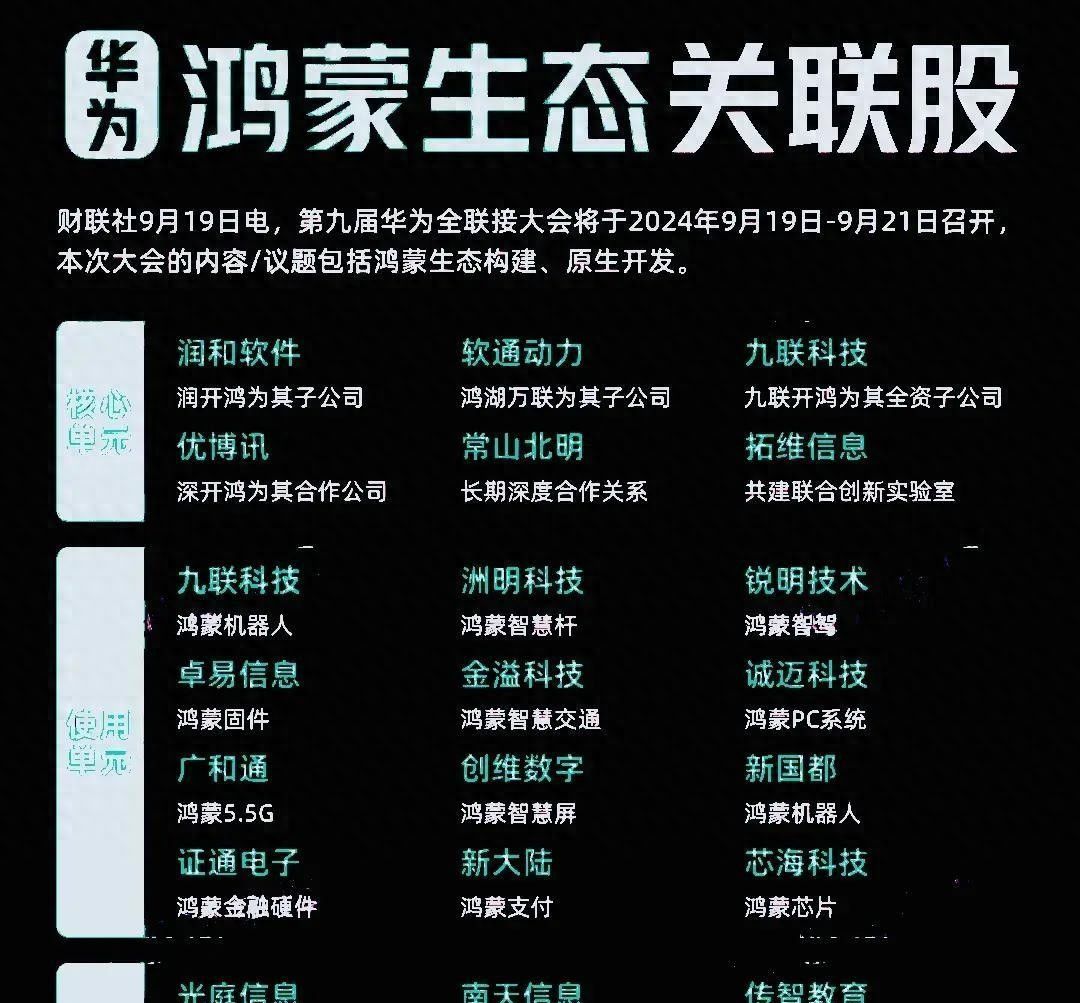 润和软件(子公司润开鸿)、软通动力(子公司鸿鹄万联)、九联科技--九联开鸿,深圳国资委--深开鸿