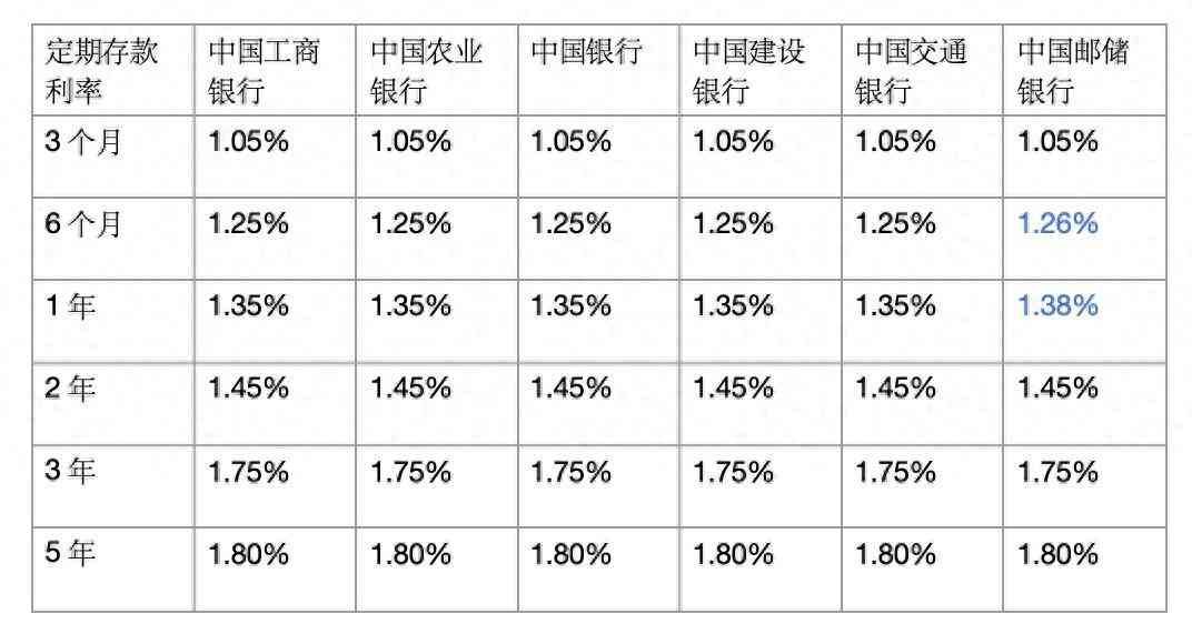 中国邮政储蓄银行的6个月和1年期存款利率稍高,分别为1.26%和1.38%。