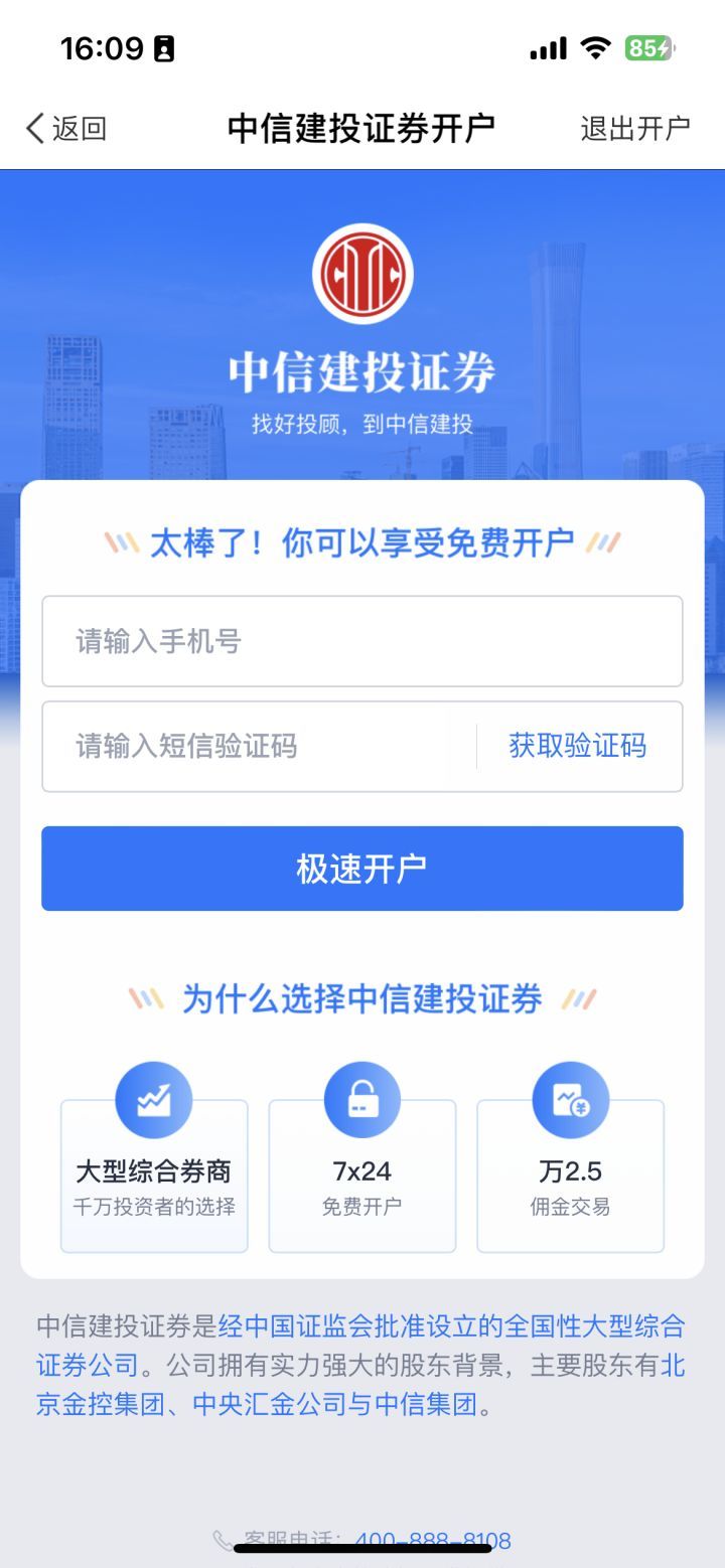 潮新闻记者选择了最上面的中信建投证券,手机号码和验证码,然后进入身份证比对,填写基础信息,完成风险测评,签署风险揭示书,三方存管绑定银行卡,开户完成。整个过程大概花费了3分钟。