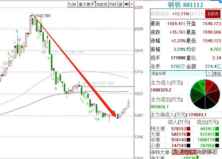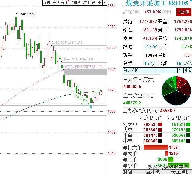 从行业板块来看今天金属新材料、钢铁、煤炭、包装印刷、白色家电等涨幅居前。这其中的钢炭、煤炭特别值得注意。观察钢铁与煤炭的指数走势,发现这二个板块是9月份以来,短期跌幅较大,但反弹相对来说是比较弱的,一个比较弱的板块变成了涨幅居前的板块,往往意味着短反弹又可能要结束了。