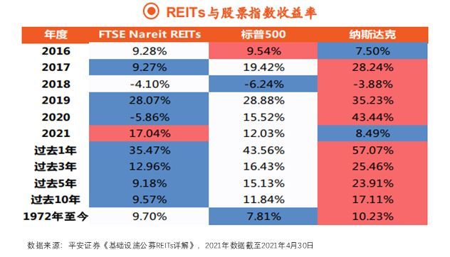 根据平安证券的报告,从有正式数据的1972年至2021年,在这将近50年的时间里,美国资本市场中REITs的年化收益率大概在9.70%左右,高于标普5,低于纳斯达克。