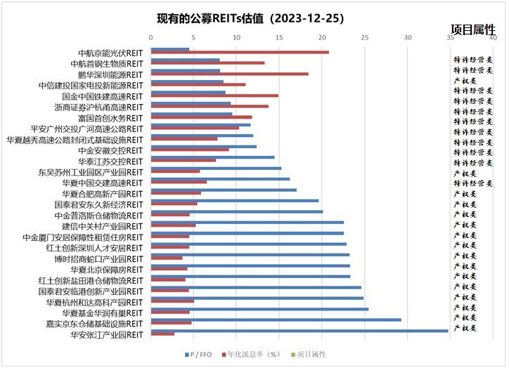 现有的这些公募REITs,我们可以发现非常明显的特征,特许经营权类REITs是高的年化派息率,同时比较低的P/FFO,一般都在10以下。产权类REITs则刚好相反,年化派息率比较低,而P/FFO比较高,一般都要在20左右。