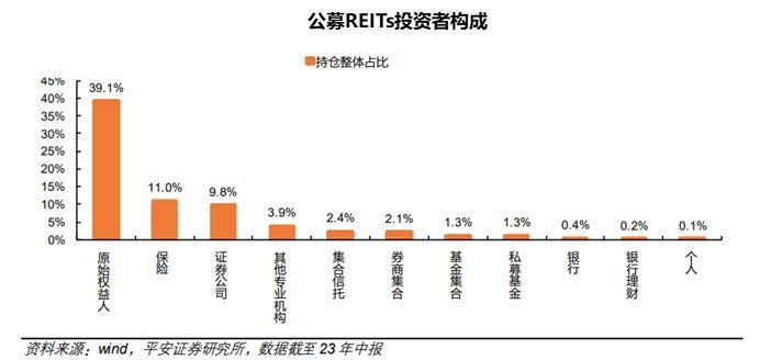 按照平安证券的数据,公募REITs的投资者中,只有0.1%的个人。除了原始权益人之外,两个最主要的投资者是保险和证券公司,各占10%左右。