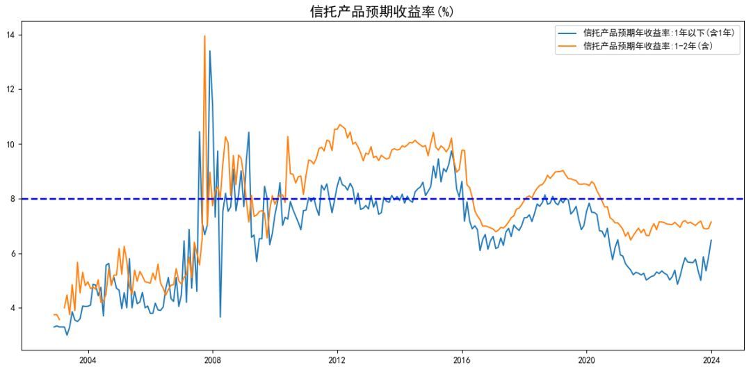 我们一般将10年期国债收益率作为无风险利率,实体经济面临的实际利率水平可以看信托产品的预期收益率。27-2016年这一段时间,信托产品的预期收益率在8%以上,整体偏高。2020年之后,收益率陡然下降,未来大概率还要往下走。