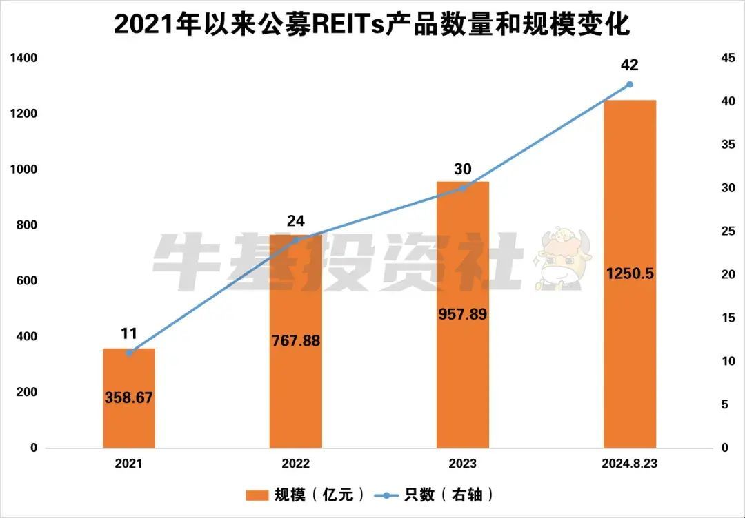 我国的REITs起步较晚,但近年来发展迅速,从最初的讨论、研究和探索,到类REITs产品发行,再到公募REITs试点,经历了近二十年的时间。2021年6月21日,随着首批9只公募REITs产品正式上市交易,这标志着国内公募REITs试点正式落地。随后我国公募REITs市场快速发展,发行规模不断攀升,截至2024年8月23日,我国已成立的公募REITs产品共42只,基金规模超千亿元,累计分红规模超百亿元,显示出良好的增长势头。