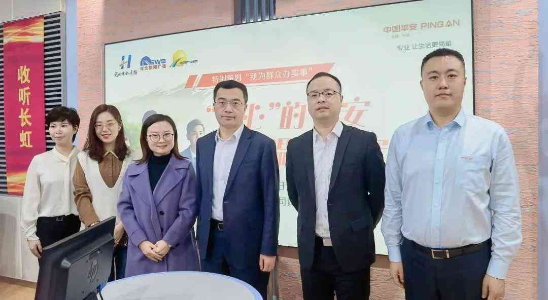 (从左至右)线客部经理任雪;个人非车及意健险部经理刘娟;《阳光热线》主持人高芳;平安产险河北分公司副总经理常晓东;财意险部经理侯佳杰;理赔部经理谭少朋