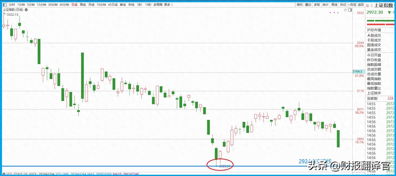 今天上证指数下跌了51个点,全天的跌幅达到了1.67%,并且收出了一根光头、光脚阴线,这是一个非常不好的征兆。因为目前上证指数离翻译官讲过的那条支撑线只有48个点,真让人有些大限将至的感觉。