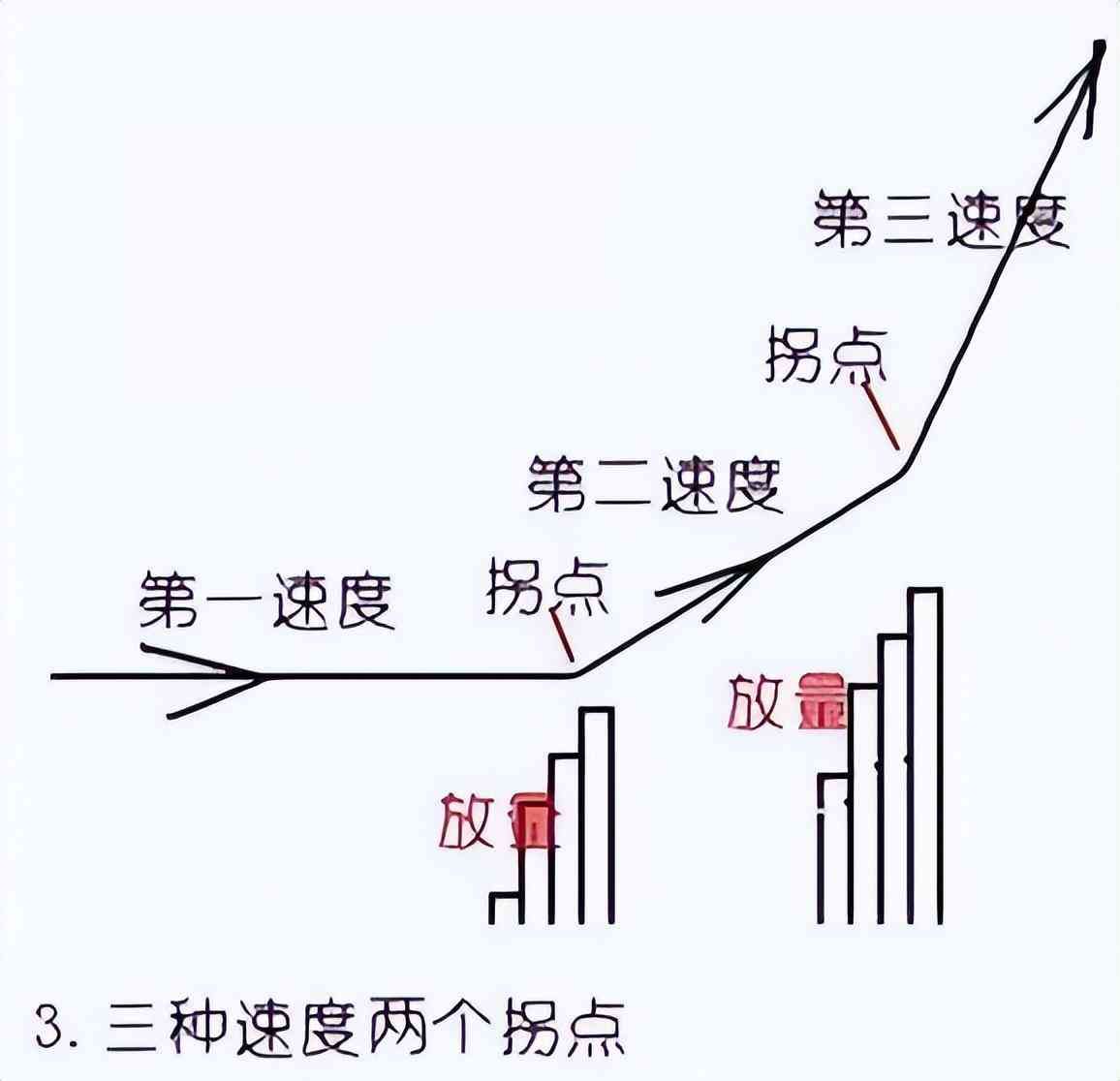 运行到D点时,股价突然拉升,收中阳线,成交量急剧放大,当K线冲过第一上升速度线时,那就意味着股价上升速度加快。由第一上升速度进入第二上升速度肯定会有一个拐点,这是一个极佳买点。