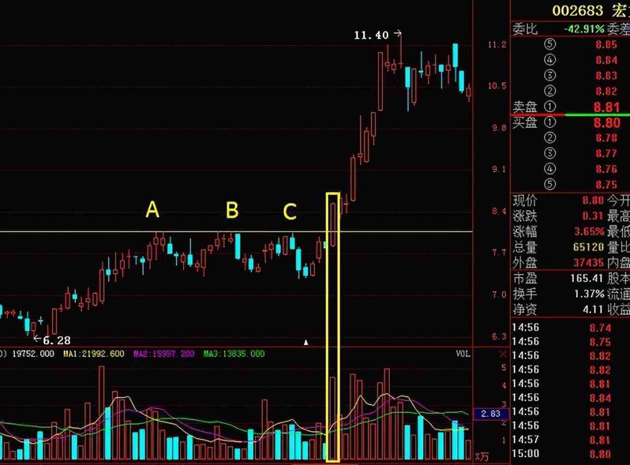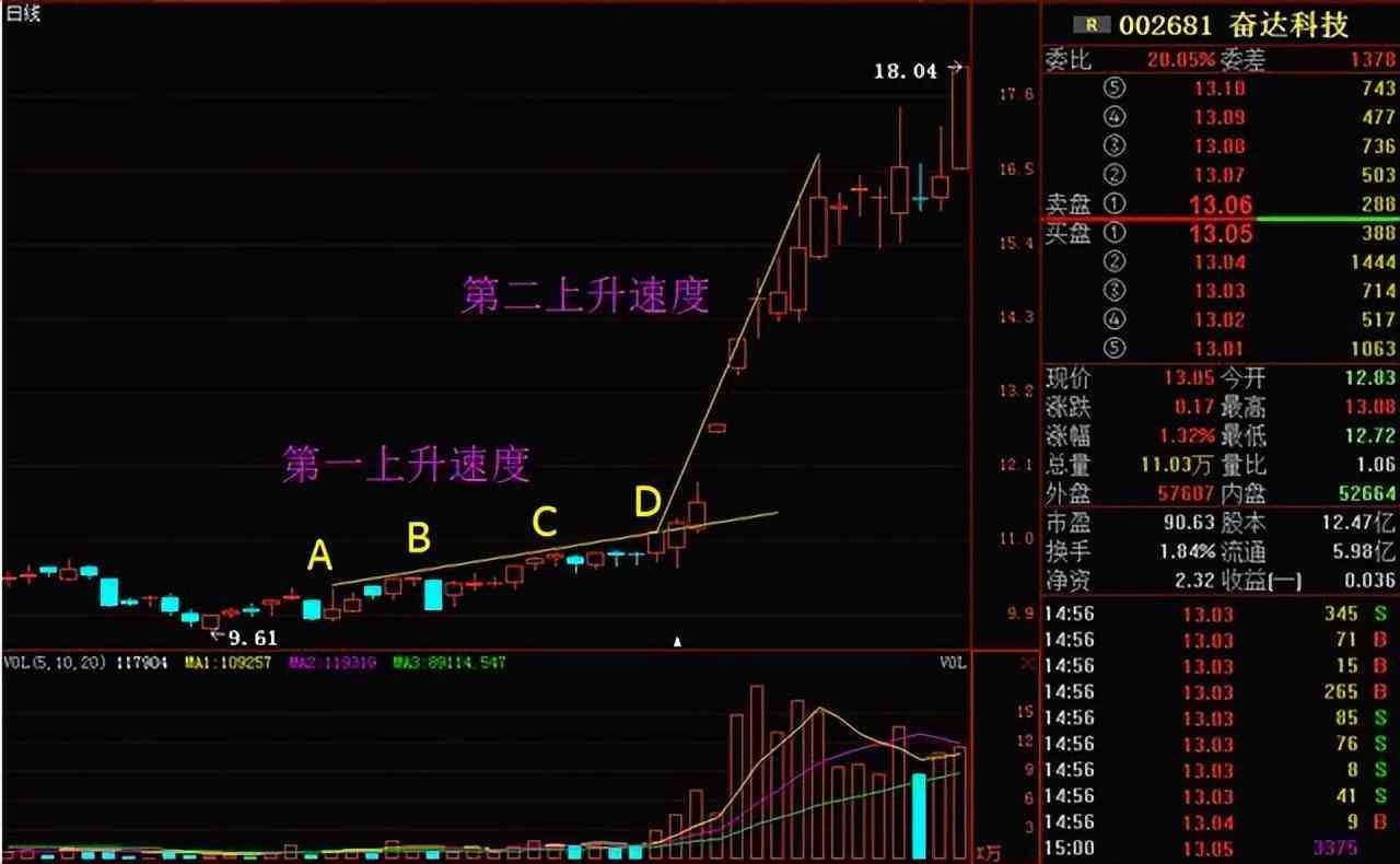 A、B、C三个高点几乎水平,意思就是第一上升速度为水平。5月8日放量拉升,成交量有前期三倍之多。这时均线向上发散,K线向上突破第一上升速度压力,进入第二上升速度。随后几天成交量持续放大,这就说明股价上涨得到成交量支持,后颈很足。