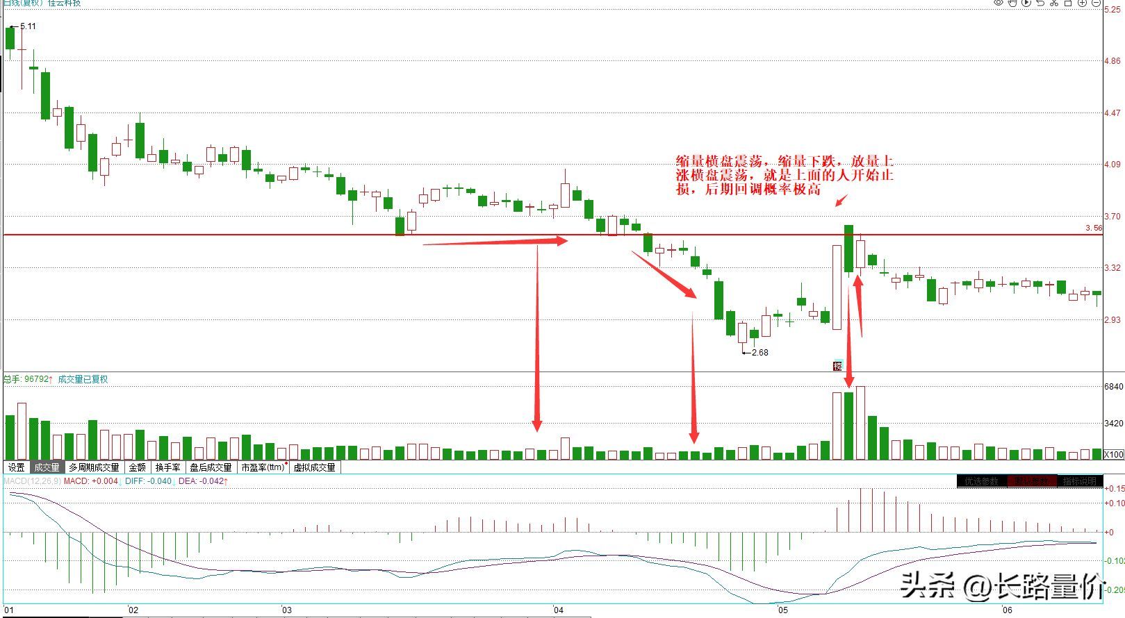 所以如果个股突然之间开始放量,但是放量的位置是在上面横盘震荡的下沿附近,就说明前期套牢盘开始止损,如果这种放量上涨开始横盘震荡,那么后期出现回调几乎是不可避免。