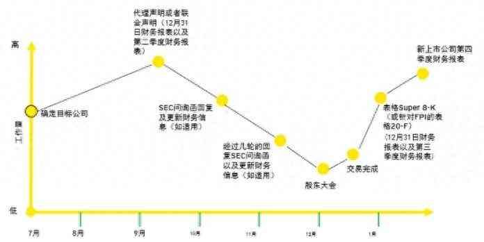 下图展示了一旦确定了目标公司并签订了企业合并协议,De-SPAC交易的时间线和工作量(在此例中,于7月1日确定了目标公司)。