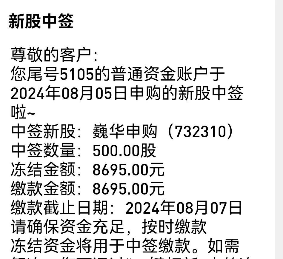 虽然以前打新偶尔也中过签,但这次特别令我感动,特别高兴,特别没有想到在我的生日打新中签。大A,对我真好,我会一如既往的支持你,支持你就是支持自己祖国的企业,不管何时都不嫌弃你,理智地对待你,智慧地与你相处。