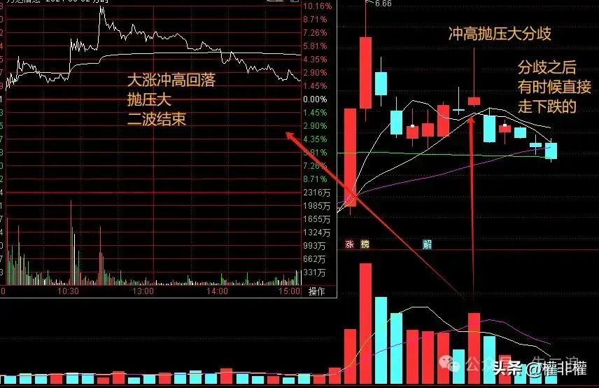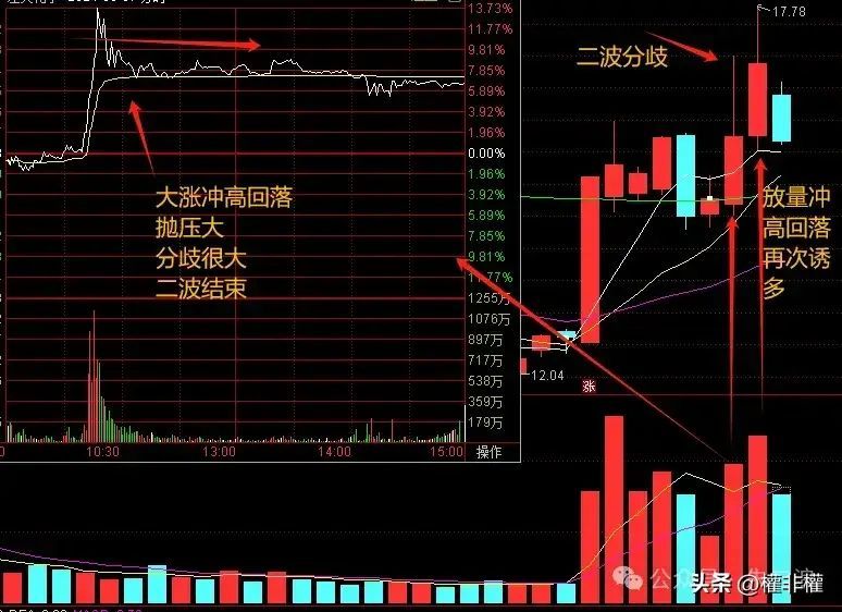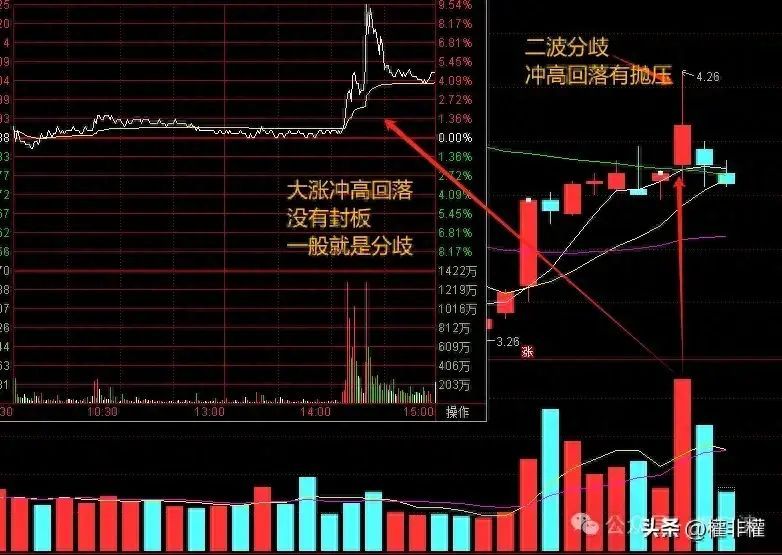 冲高回落,尤其是大幅上涨后的冲高回落,极易形成高点,一般意味着二波结束,次日大概率低开,有时低开低走后走势疲弱,所以,诱导性拉升未封住涨停通常意味着分歧。