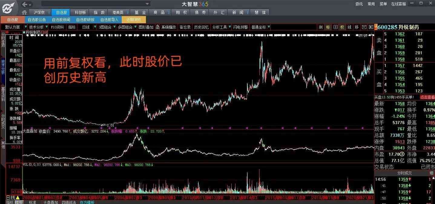 用前复权看,此时股票位置较高,已处在历史高位,股价也创出历史新高,同一只股票,差别可谓天壤之别