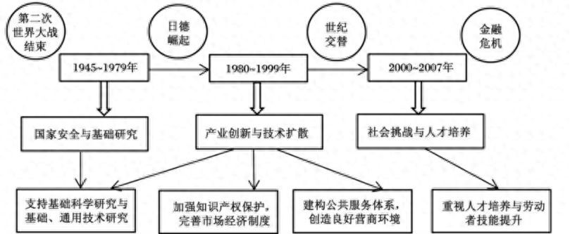 科技型企业的“修行飞升”往往也会得到国家产业政策的“保驾护航”。以美国为例,美国政府通过颁布一系列法案,逐步构建起一个以创新政策为核心的产业政策体系,从最初以国家安全为主导的基础研究,到后来的产业创新与技术传播,再到应对社会挑战和人才培养,产业政策落脚点也从巩固国防向促进科技创新和经济发展转变。
