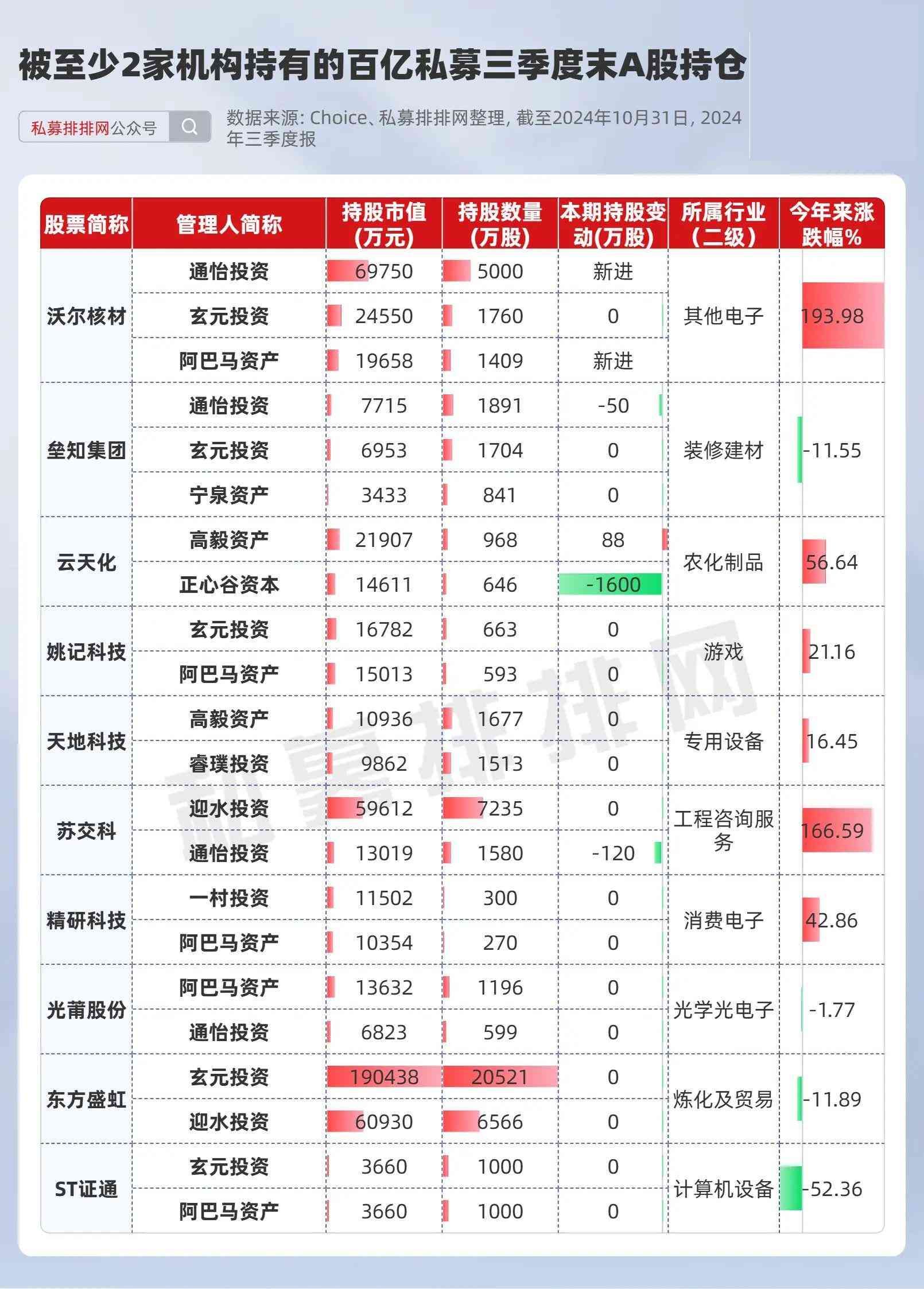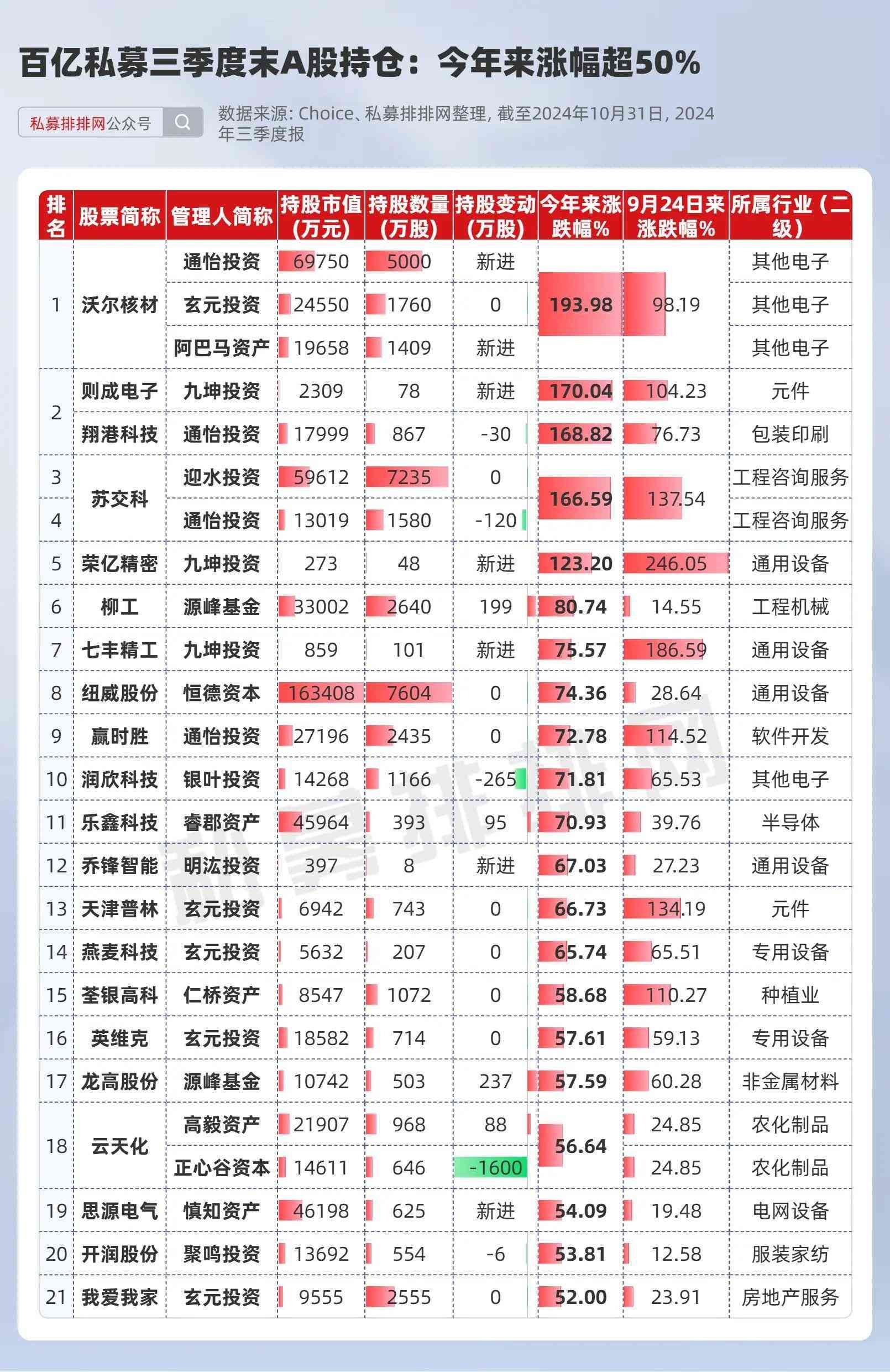 从私募管理人角度看,玄元投资的持股最多,共有5只。其中,沃尔核材今年来涨幅最高,达193.98%,玄元投资、阿巴马资产、通怡投资分别为其第6、第7和第8大流通股东,合计持有市值11.39亿元。
