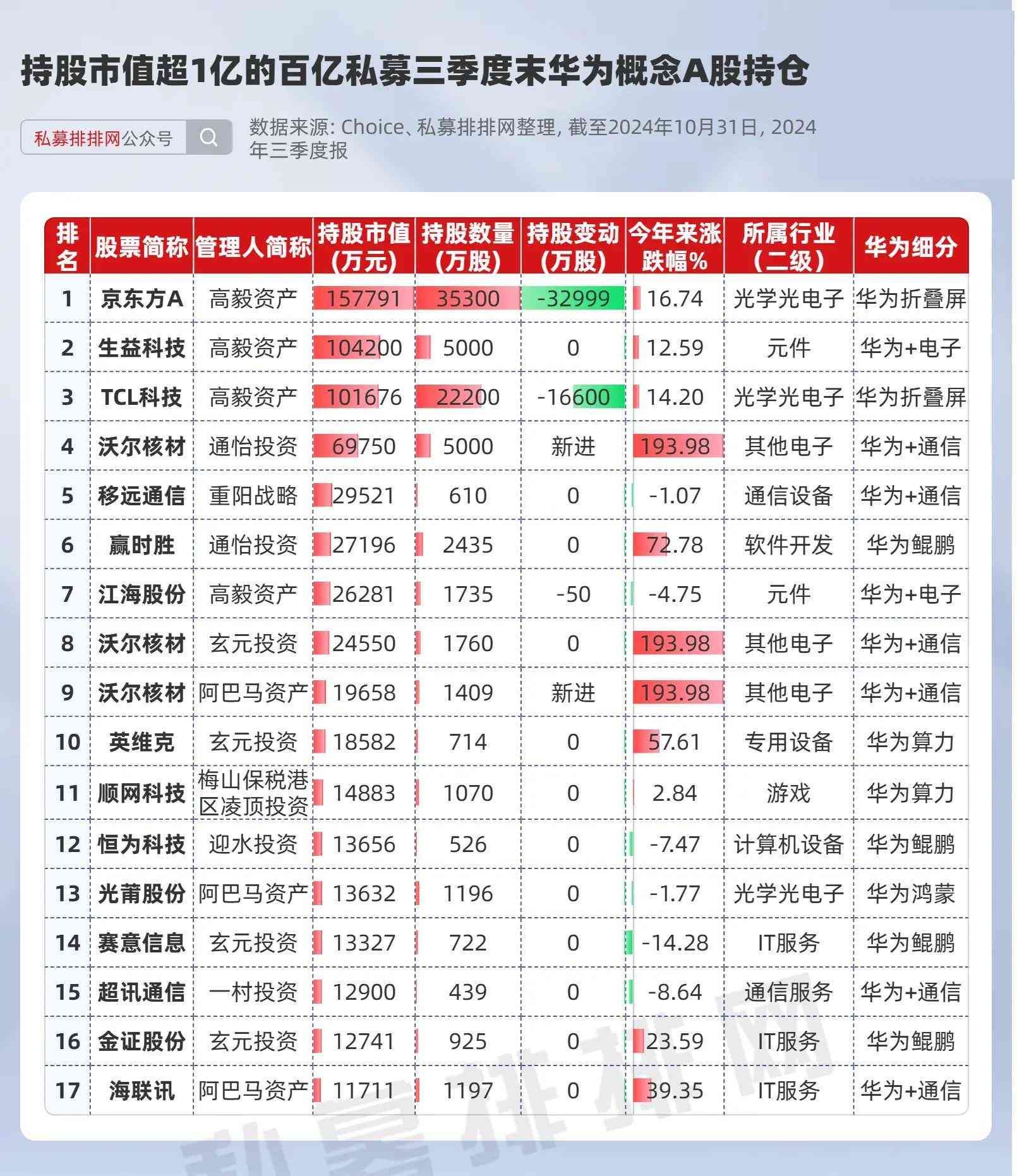 笔者因此整理出了持股市值超1亿以上的15只百亿私募华为概念重仓股,这15只个股9月24日以来均实现上涨,供大家参考。其中,有1只个股被3家私募共同持有。