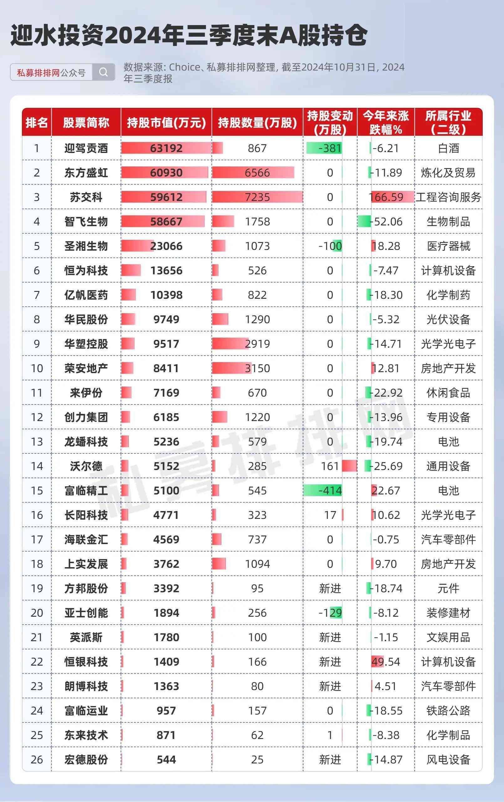 数据显示,迎水投资共持有26只个股,持股市值达37.14亿元,持股数和持股市值分别在33家百亿私募中位列第3名和第4名。该私募三季度新增个股有5只,减持个股有4只。