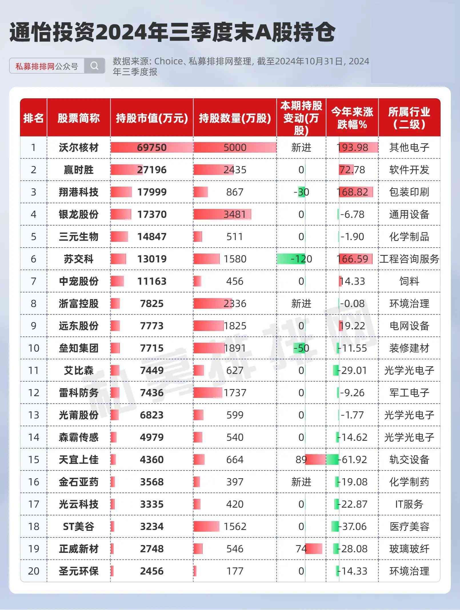 数据显示,通怡投资三季度持有20只个股,持仓市值达24.1亿元,其中12只个股保持不变,2只被加仓,新进、减持个股均有3只。从涨跌幅来看,旗下共有3只个股今年来涨幅超150%。
