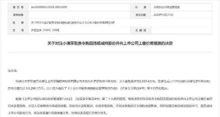 《关于对汪小清采取责令购回违规减持股份并向上市公司上缴价差措施的决定》指出,汪小清通过大宗交易方式受让上海艾融软件股份有限公司大股东持有的股份130万股,买入金额合计为2,222.4万元,在受让后六个月内减持所受让的130万股,卖出金额合计为3,296.1万元。以上行为违反了《上市公司股东减持股份管理暂行办法》(证监会令第224号)第十四条的规定。