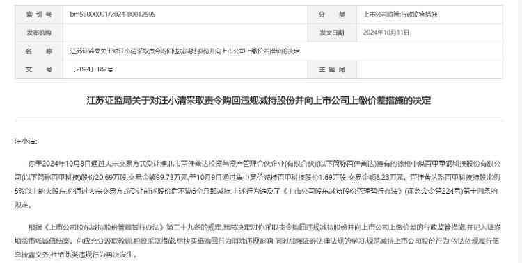 10月11日,江苏证监局发布《关于对汪小清采取责令购回违规减持股份并向上市公司上缴价差措施的决定》。该《决定》指出,汪小清2024年10月8日通过大宗交易方式受让淮北市百佳善达投资与资产管理合伙企业(有限合伙)(以下简称百佳善达)持有的徐州中煤百甲重钢科技股份有限公司(以下简称百甲科技)股份20.69万股,交易金额99.73万元,于10月9日通过集中竞价减持百甲科技股份1.69万股,交易金额8.23万元。百佳善达系百甲科技持股比例5%以上的大股东,通过大宗交易方式受让前述股份后不满6个月即减持,上述行为违反了《上市公司股东减持股份管理暂行办法》(证监会令第224号)第十四条的规定。