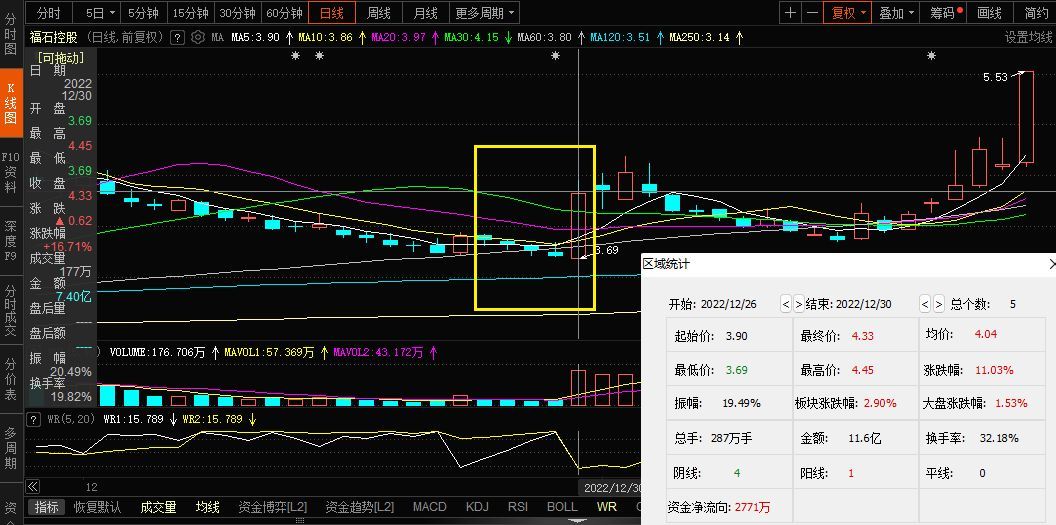图1是我从东方财富炒股软件中,截取的福石控股(371)的近期走势图。我们计算2022年12月30日MR数值,计算周期为5天。图1中黄色方框圈起来的区域为5天的走势K线,时间为12月26日至12月30日。在这5天中,最高价为4.45元,最低为3.69元,12月30日收盘价为4.33元。