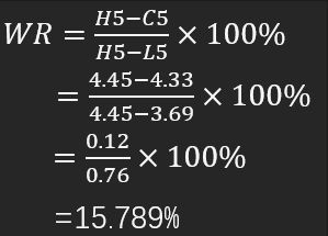 周期内的最高价Ht和计算日的收盘价Ct相同,则WR为0。以福石控股,计算日为12月30日,周期是5为例。假设当天的收盘价为4.45元,是5天的的最高价(实际上当日的收盘价是4.33元),WR为0。周期内的最低价Lt和计算日的收盘价Ct相同,那分母和分子相同,则为1%。12月30日该股下跌,收盘价为3.69元,是5天的最低价,这时WR就为1%。WR越接近0,计算日收盘价越接近周期内的最高价,WR越接近1%,计算日的收盘价越接近周期内的最低价。如果计算日是当日,就能说明当日的股价处于周期内的价格位置。