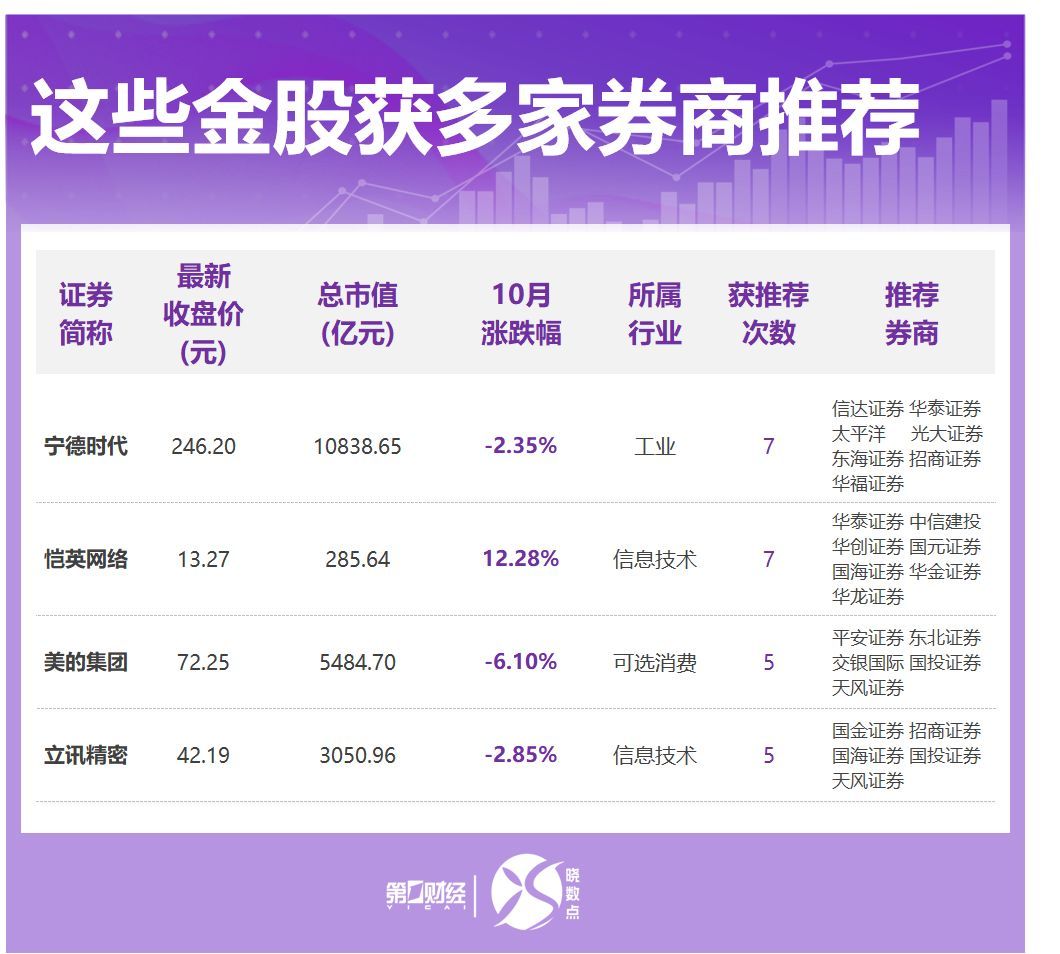 据不完全统计,在各家券商的“金股”名单中,获机构推荐次数最多的是宁德时代、恺英网络,均获得7家券商的推荐。