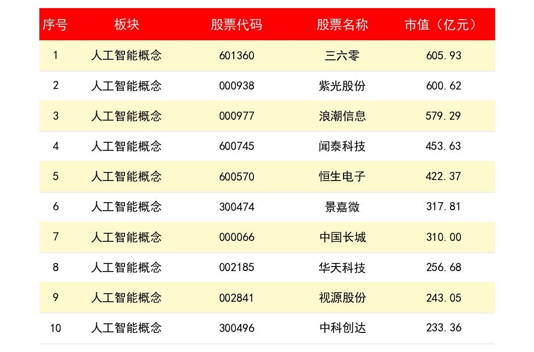 三六零(SH601360)总市值为 605.93亿元;紫光股份(SZ938)总市值为 6.62亿元;浪潮信息(SZ977)总市值为 579.29亿元。下表为所有人工智能概念上市公司龙头股市值排名一览表: