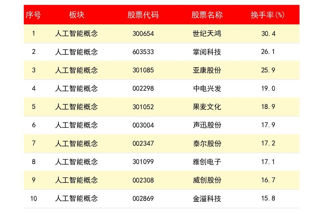 世纪天鸿(3654)过去10日平均换手率为 30.4%;掌阅科技(603533)过去10日平均换手率为 26.1%;亚康股份(301085)过去10日平均换手率为 25.9%。中电兴发(2298)过去10日平均换手率为 19%。果麦文化(301052)过去10日平均换手率为 18.9%。下表为所有人工智能概念上市公司龙头股最近10个交易日平均换手率排名一览表: