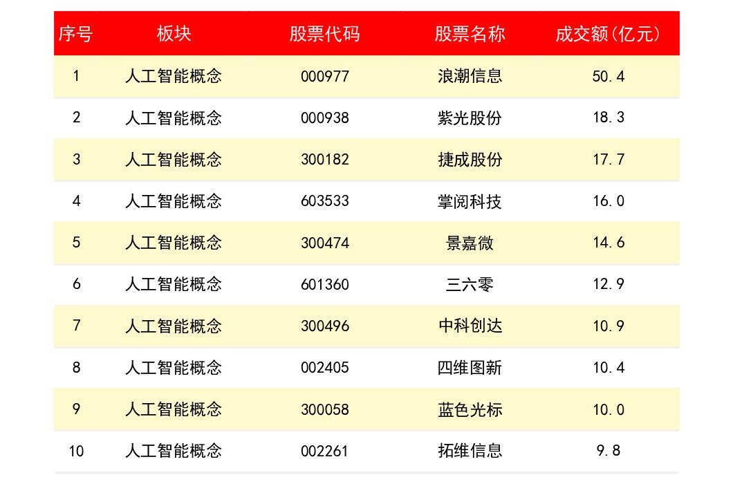 从成交额度排序来看,人工智能概念上市公司龙头股有哪些?成交额排名如何呢?