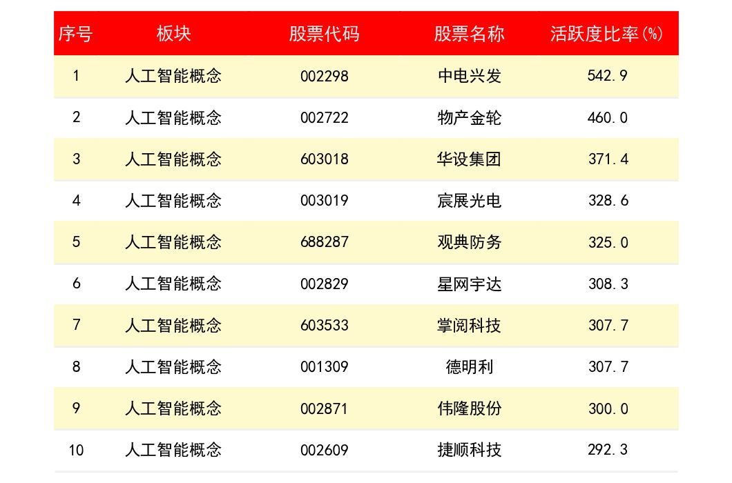 中电兴发(2298)成交活跃比率为 542.9%;物产金轮(2722)成交活跃比率为 460%;华设集团(603018)成交活跃比率为 371.4%。宸展光电(3019)成交活跃比率为 328.6%。观典防务(688287)成交活跃比率为 325%。下表为所有人工智能概念上市公司龙头股近期成交活跃度排名一览表: