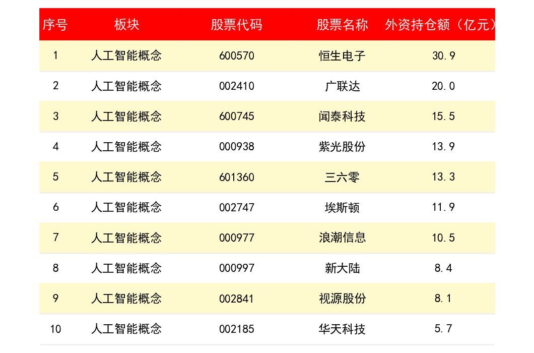 维度七:人工智能概念板块外资持仓额排名