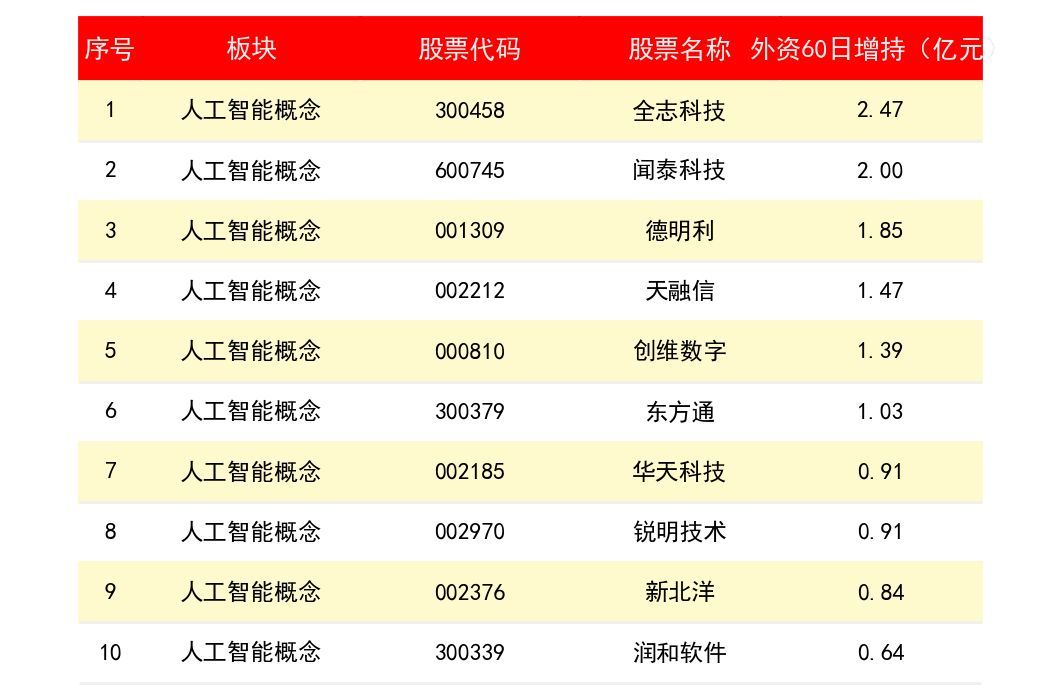 维度九:人工智能概念板块外资60日增持额度排名