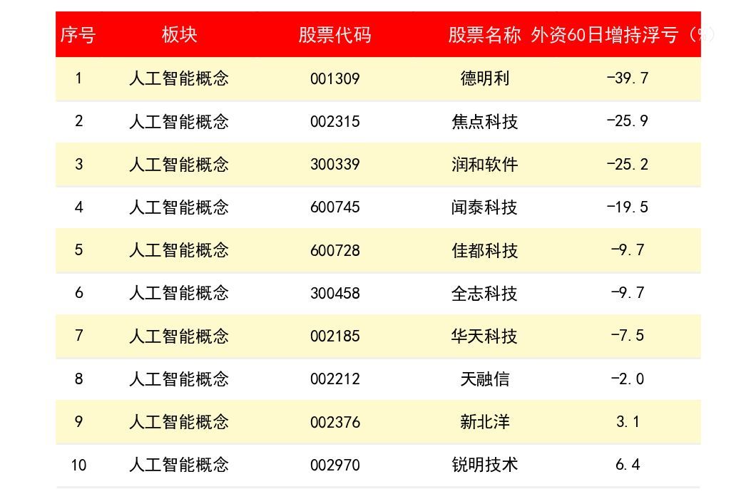 全志科技(3458)外资近60日增持金额为 2.47亿元;闻泰科技(6745)外资近60日增持金额为 2亿元;德明利(1309)外资近60日增持金额为 1.85亿元。下表为所有人工智能概念上市公司龙头股外资近60日增持金额排名一览表: