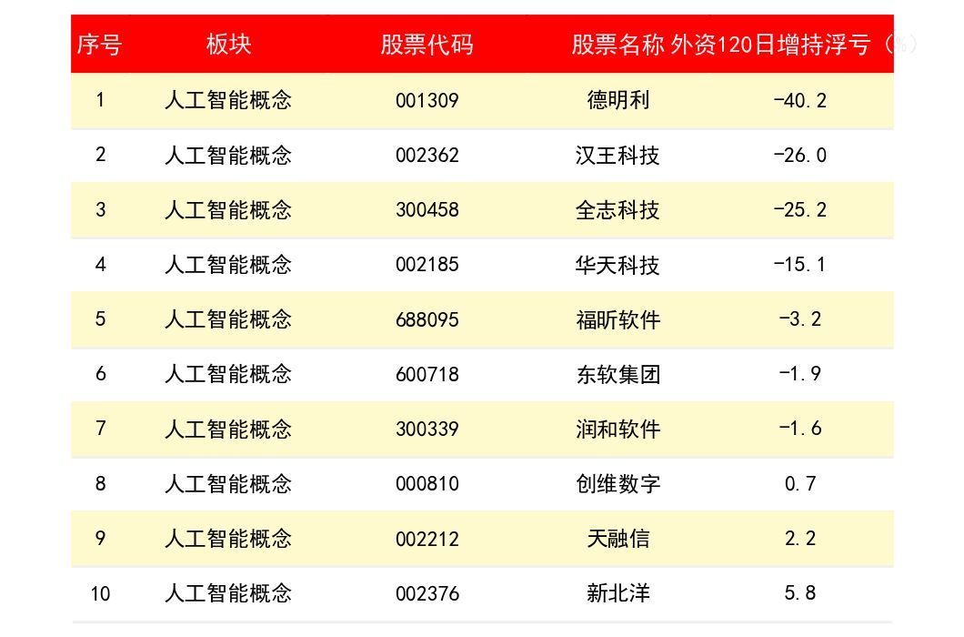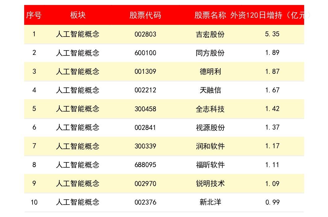 吉宏股份(2803)外资近120日增持金额为 5.35亿元;同方股份(61)外资近120日增持金额为 1.89亿元;德明利(1309)外资近120日增持金额为 1.87亿元。天融信(2212)外资近120日增持金额为 1.67亿元。全志科技(3458)外资近120日增持金额为 1.42亿元。下表为所有人工智能概念上市公司龙头股外资近120日增持金额排名一览表: