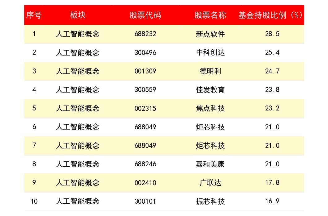 维度十三:人工智能概念板块公募基金持仓比例排名