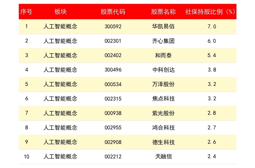 华凯易佰(3592)社保资金持仓占比为 7.9%;齐心集团(2301)社保资金持仓占比为 0%;和而泰(2402)社保资金持仓占比为 14%;中科创达(3496)社保资金持仓占比为 25.4%;下表为所有人工智能概念上市公司龙头股社保资金持仓占比排名一览表: