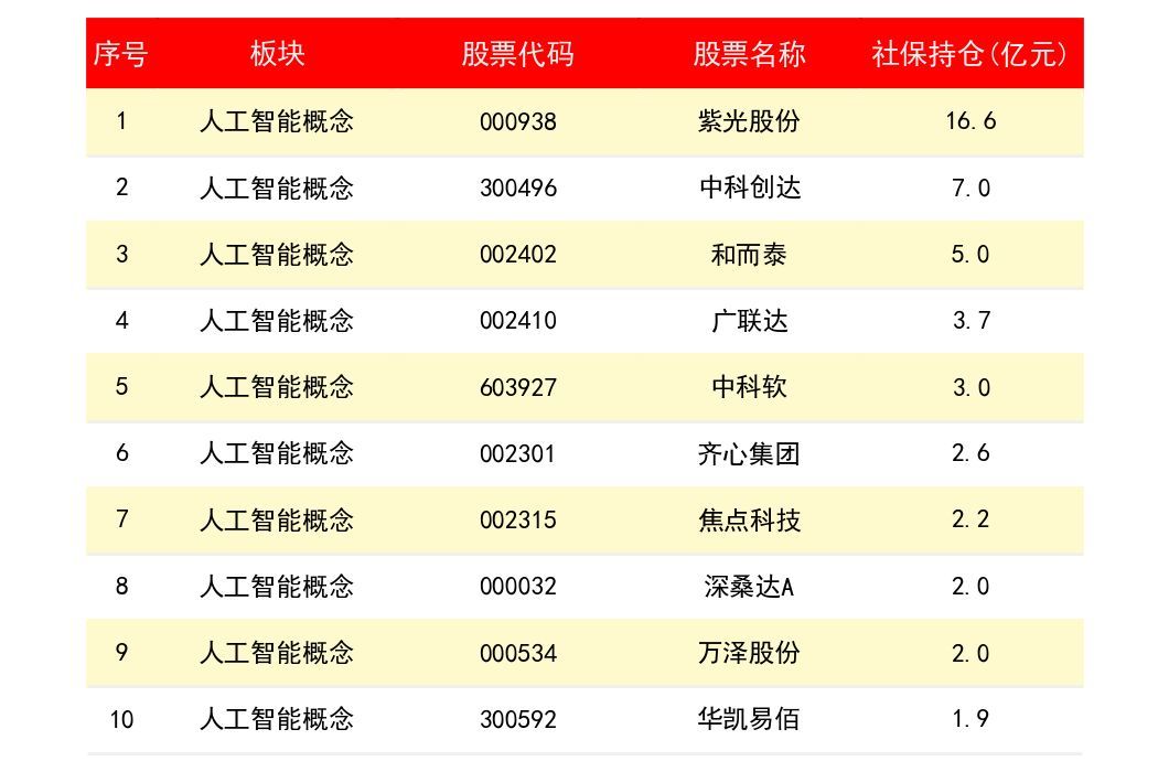 紫光股份(938)社保资金持仓金额为 16.6亿元;中科创达(3496)社保资金持仓金额为 7亿元;和而泰(2402)社保资金持仓金额为 5亿元;下表为所有人工智能概念上市公司龙头股社保资金持仓金额排名一览表: