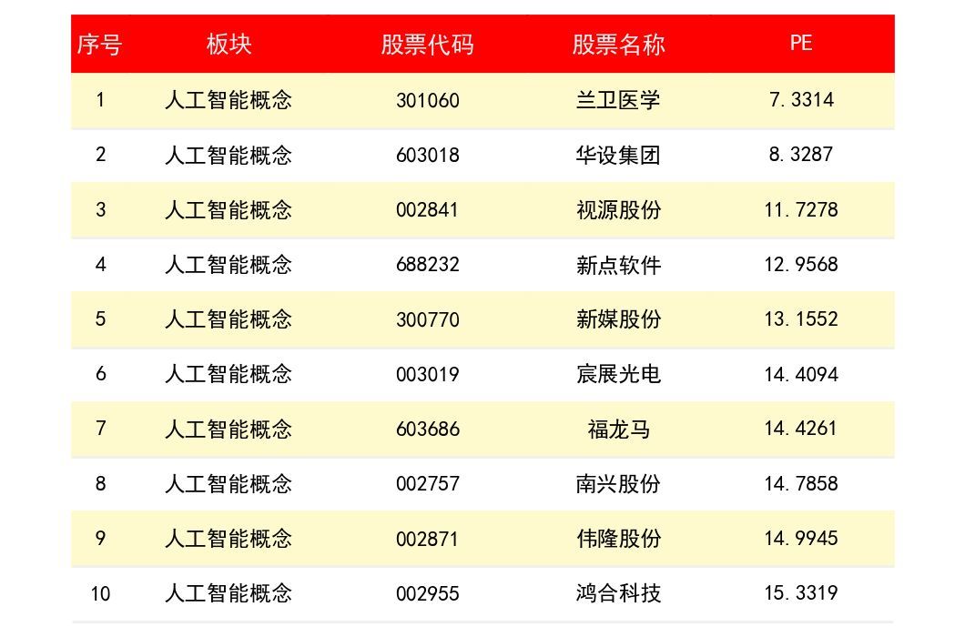 兰卫医学(301060)PE为 7.3314。华设集团(603018)PE为8.3287。视源股份(2841)PE为 11.7278。新点软件(688232)PE为 12.9568。新媒股份(3770)PE为 13.1552。下表为所有人工智能概念上市公司龙头股PE排名一览表:
