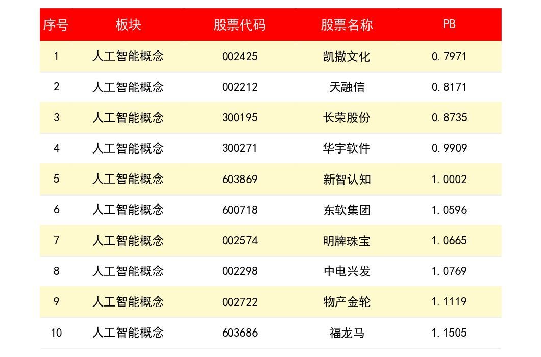 凯撒文化(2425)PB为 0.7971;天融信(2212)PB为0.8171;长荣股份(3195)PB为 0.8735。下表为所有人工智能概念上市公司龙头股PB排名一览表: