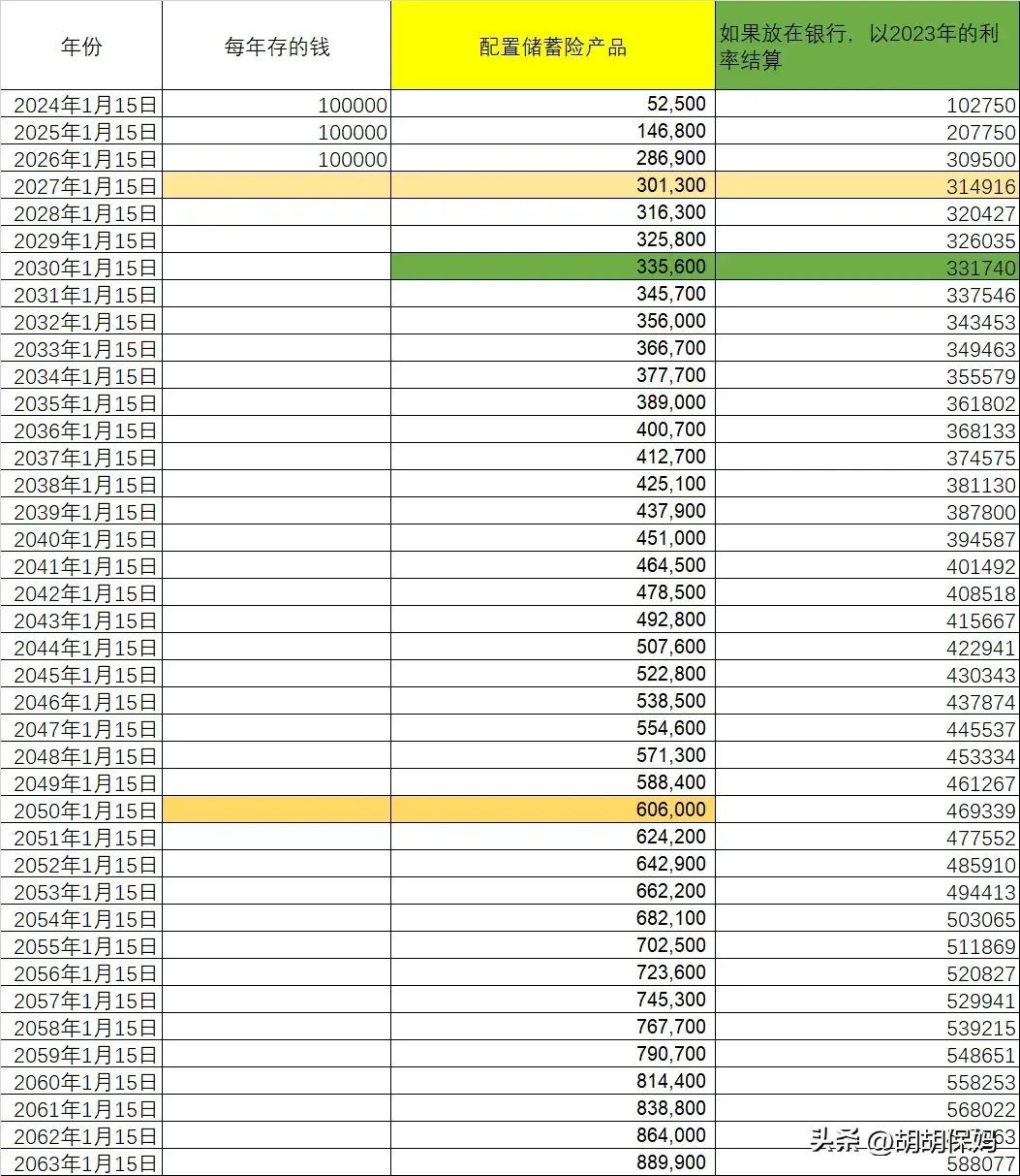 但5年后,保单里的钱不仅超过了放银行,并且差距会越来越大。