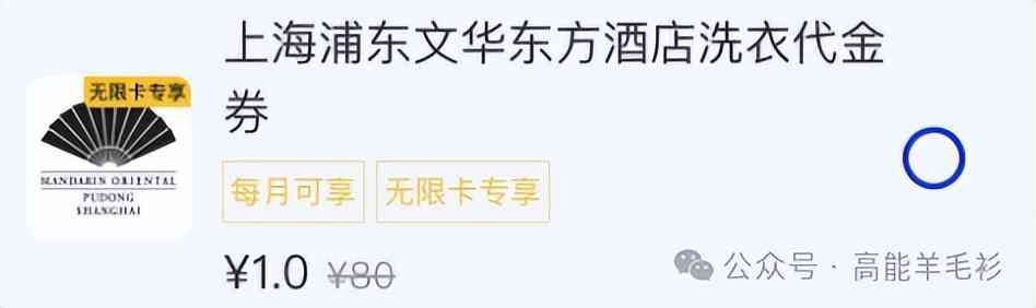 例如:仅无限卡专享的高端酒店洗衣房现金抵用券服务,每月可以用1元购买高端酒店洗衣代金券一张。